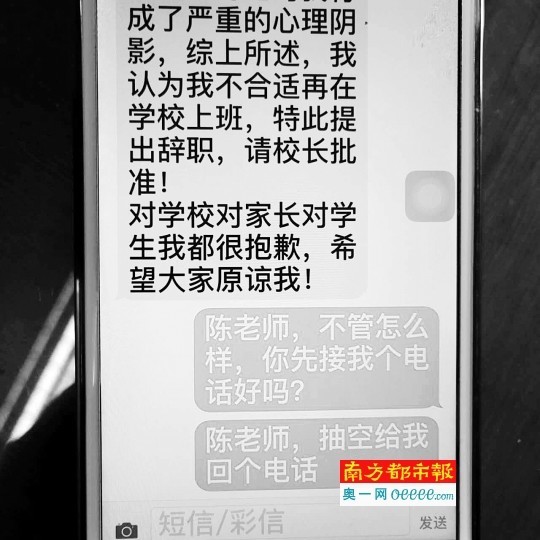 多次拨打电话都没有接听后,陈老师给周校长发来一条短信。记者看到,陈老师在该短信中说“这次犯了不可原谅的错误,对学生和家长带来了不好的影响,也辜负了学校的信任,自己心里也有了阴影,不适合再在学校上班,决定提出辞职。”记者随后也多次拨打了陈老师的电话,也都是一直没有接听。